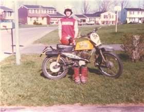 I’m pictured here at age 14 with my 1973 DKW 125 Enduro, this was my first big bike in the late 70’s and this was given to me by my father who used to ride and swear by this bike. Notice the leading link front end suspension. There are no conventional forks here. This was a swing arm with a shock up front that traveled up and down. The engine was really solid and had about as much compression as a modern KX500. You had to jump on the left sided kicker with single kicks to get it to fired up and this bike had enough power to run with most Japanese 250’s back then and if you look closely it is pretty tricked out. All the metal (tank, fenders, etc) was replaced with plastic, the bars were replaced, and the seat was shortened and custom made. This bike was pretty heavy but I used to fly this thing pretty far through the air and it jumped really well. The landings were a bit harsh though. Although it did not turn very well at high speeds, it handled pretty well overall.