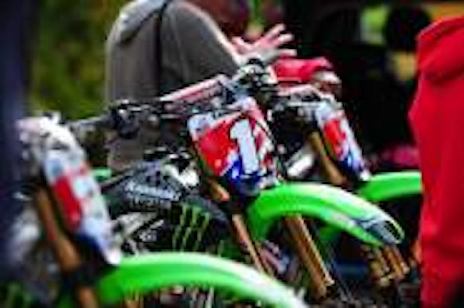 James Stewart's and Timmy Ferry's factory KX450Fs are ready for racing this weekend at Donington. Here they sit ready to ride at Tommy Searle's practice track.