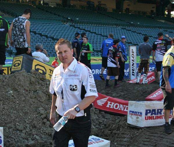 Upon arriving at Anaheim I went right to walking the track. I should mention that I walk the track pretty much every week and that’s hilarious when you think about it. Why do I need to walk the track? Am I going to tell any of those pro riders anything that could possibly help them? When I walked the track with my riders I used to ask them if they were actually going to quad this or I’d just look at something and whistle. A few times when Nick Wey would ask me what I thought of something I’d say that since practice hasn’t actually started and he should go see if he could get his money back from the AMA. Supercross tracks are very big and very scary for some people. What usually happens is I end up talking to Weege and Cox and we bug every rider that walks by us.
