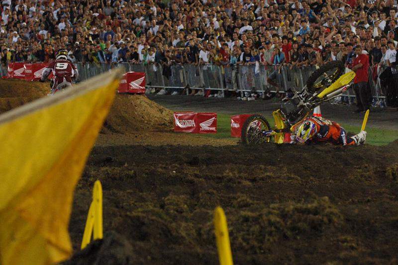 For the second time this season, the drug-test folks showed up at New Orleans. The first time was at San Francisco. The testing goes for the FIM racers – in other words, the 450cc guys. It sounds like they tested second, third, and fourth place, and while I didn’t hear of Chad Reed having any problems, both Broc Hepler and Kevin Windham had a tough go of it. Neither could produce enough liquid for the pee test for quite a while, and it was especially bad for Windham, who was at his home race and had tons of fans waiting for him back at his truck.