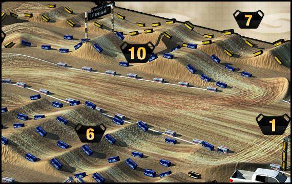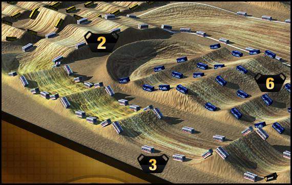 7/8.) I think you want to stay tight in the next corner so you can sit down and jump the triple. Then it looks like it goes three into the corner, the only thing is that turn is flat and could be hard to stop. This is just like Atlanta where you couldn’t stop for the turn; same part of the stadium also. You could actually double-single to the inside, depending on the dirt and the traction. Then you’re into a decent size set of whoops and then a bowl turn.