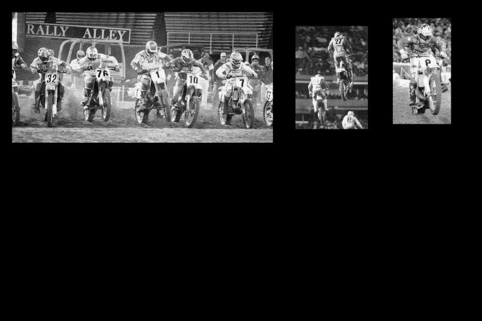 Cooper had the lead for the second time but was now under fire from Rick Johnson, the former king of the sport who was logging his last, best race. RJ had been struggling for a year with a trashed wrist, but he fought through the pain on this night, went after Cooper and got the lead. By about that time, RJ’s old rival Jeff Ward began to appear on the scene. Then RJ’s wrist started to give out, Cooper turned it up and passed him back for the top spot. With two laps to go, it looked like Cooper was finally going to nail down his elusive first-ever supercross win. But Ward found a sneaky line through the whoops and passed Johnson on lap 19 then mounted a last charge after Cooper as the white flag flew. He used the same line through the whoops to sneak up on Cooper, snagging the lead with just a few turns left, and winning in ultra-dramatic fashion.