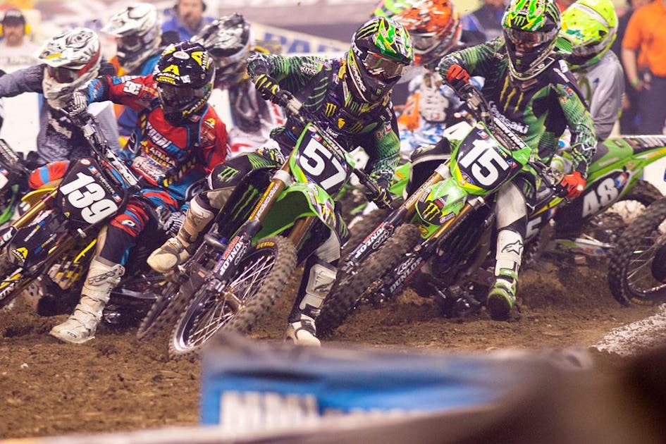SX Heat 2: James Stewart grabbed the holeshot here with Trey Canard right behind him, then Justin Brayton and Ryan Dungey. Stewart pulled away a bit, but everyone on the track made mistakes, so things went back and forth. Late in the race The Dunge pulled up on Brayton but could not make the pass. Stewart, Canard, Brayton and Dungey in this one, Tedesco, Simmonds Byrne, Blose and Boni going to the main—we list their names because we have time.