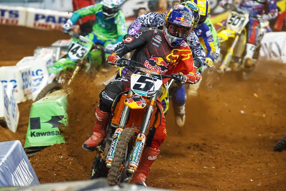 Hello, everyone, and welcome to the Rev Up. Recently I’ve found myself sitting back with my arms crossed and just thinking for a while. Rather it’s in my driveway after work, or just for a moment looking out of my living room window. My mind always races forward, subject to subject, with the accuracy of a dart sans feathers. I guess I’m kind of like one of those battery powered “stompers” they had in the mid 80’s. Go like hell until it hits the wall then just turn it around and watch it run hard until something else stops it. Only when the battery ran out did it quit. Recently I’ve learned to take a moment and clear my thoughts to let things download. “Smell the roses, blow out the candles.” Take a deep breath with me right now if you would, then look over at the calender. Now, just relax and let the data catch back up. That’s right, it is already March 1 and we’re going to be over halfway through the 2012 Monster Energy Supercross series when the flag flies Saturday night.