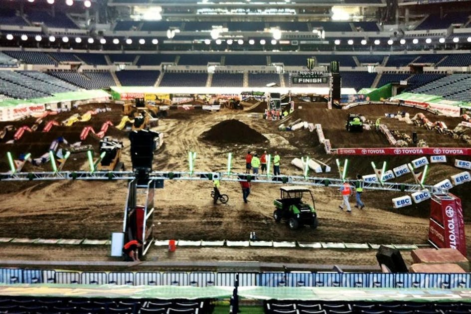 Fortunately, Monster Energy AMA Supercross goes back indoors tomorrow night with the Indianapolis SX at Lucas Oil Stadium. The race will again air live on SPEED (and the whole SPEED crew, like the riders and track crew themselves, deserve a pat on the back for the great work they did in the horrible conditions of Daytona last week). The races start at 7:30 p.m. Eastern, live on TV. And Lucas Oil Stadium will probably be filled to the brim!