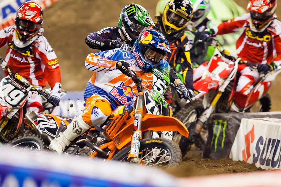 Weimer retired to the Kawasaki rig for the night as the remaining unbroken riders headed to the starting gate for the main. The riders lined up, the gate dropped, and Mike Alessi grabbed a familiar holeshot to kick off the twenty-lap race. He led a season-high five laps before succumbing to the pressure applied by Justin Brayton. Brayton seemed like a formidable candidate to fend off any advances in the main by the defending champion Ryan Villopoto after doing just that in the heat race earlier in the night. Villopoto started fifth but quickly moved past Marvin Musquin to take over fourth. Mike Alessi and Brett Metcalfe would stand between Villopoto and the leading ride by Brayton for roughly five laps. A three man battle ensued for second as Brayton attempted to strengthen his lead. Alessi dropped back behind Metcalfe and Villopoto, but Metcalfe wouldn’t let Villopoto by quite as easily. The two had quite the battle going with Villopoto making a handful of pass attempts, and eventually making one stick out of frustration, before he set his sights on Brayton. Villopoto was gaining time on Brayton, and still had some time to catch up.