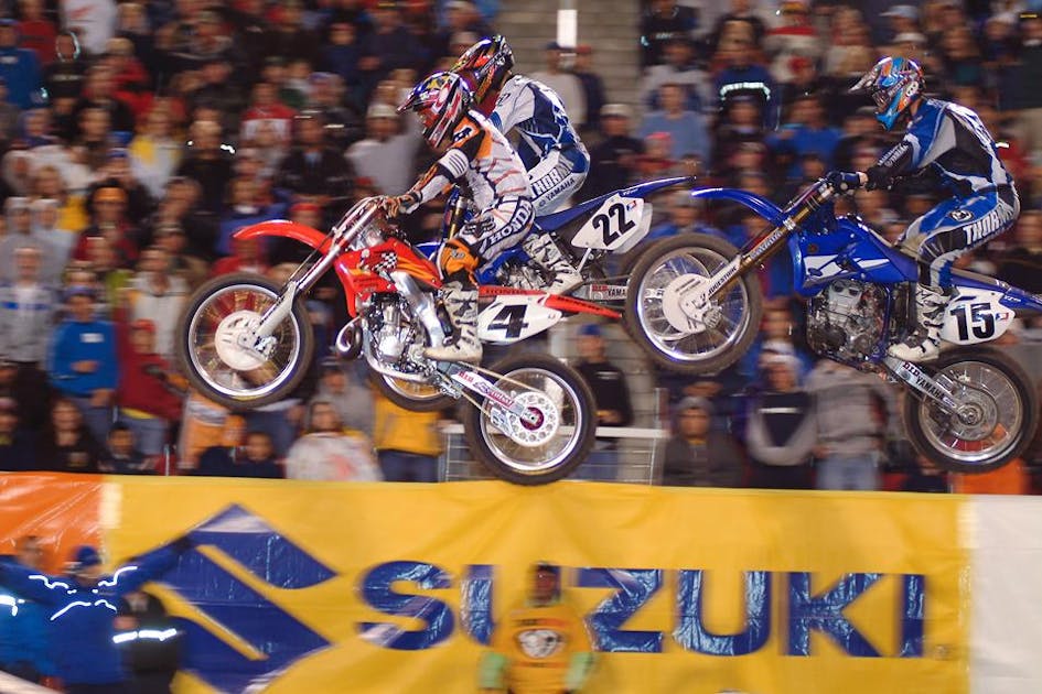 I remember that at the far end of the stadium the riders went width-wise across the stadium and then made a left turn. Immediately out of the that turn, there was a triple followed by a rhythm section and around lap two, Ferry couldn’t hold off the two yahoos behind them and they went into that left hander and partially out of my view. The next thing I see is all three guys rolling the first jump! Something had happened in the turn that made them all not able to jump the triple.