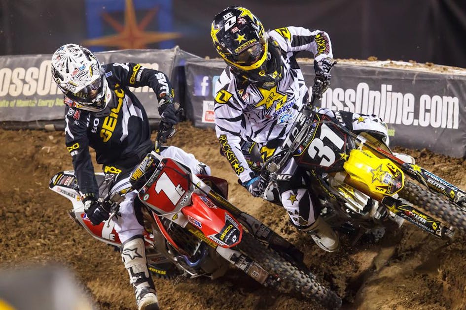 Vegas had turned into a GEICO Honda show. Justin Barcia and Eli Tomac came in with titles won, and then took their final East and West races. Then, in the Dave Coombs Sr. East/West Shootout, they got off to good starts to set up a 1E vs. 1W showdown. One rider was in between them, Rockstar Racing Suzuki’s Martin Davalos, but most everyone expected Tomac to rip past Davalos and go after Barcia. After all, the Honda boys were running the number one plates, and Davalos had only generated a single podium finish all season long.