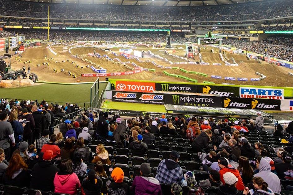 Obviously we want to make it different but honestly it’s actually not as tough as you might think because baseball-shaped stadiums like Anaheim and Phoenix, they actually can give you a little more leeway. All the rest of the stadiums even though it’s a different city, because they’re football-shaped they’re exactly the same, almost exactly the same week to week to week. So it’s kind of tough sometimes to come up with new designs for the football-shaped ones even if you’re in a different city and definitely year to year. The baseball ones you can get a little more creative. You can go long lanes down either sideline, similar to what you’d see at any Supercross. But then you’ve got that whole kind of diamond-shaped interior where if you wanted to put in something that was a little more outdoor or a little more sweepy or flowy you have the ability to do so. Personally I really like the baseball-shaped ones; I think it’s a lot more fun to design the track and build it. It’s probably about 50/50. Some of the riders like it when it’s changed up and it’s a little faster and some of the riders really like it when it’s traditional Supercross like more-or-less parallel lanes with bowl turns at the end.