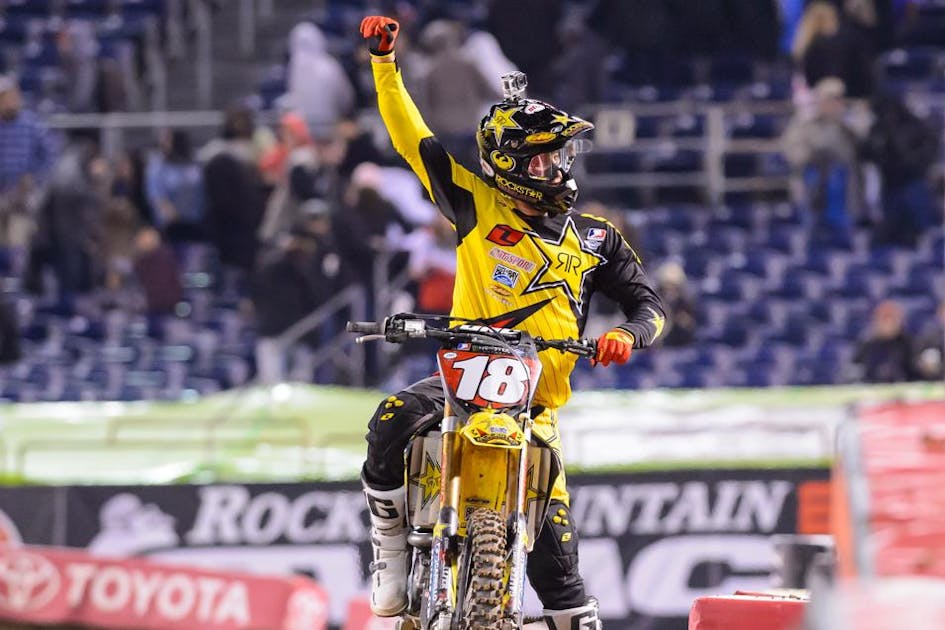 Millsaps celebrates his second win of the season with his Rockstar Energy Racing team.