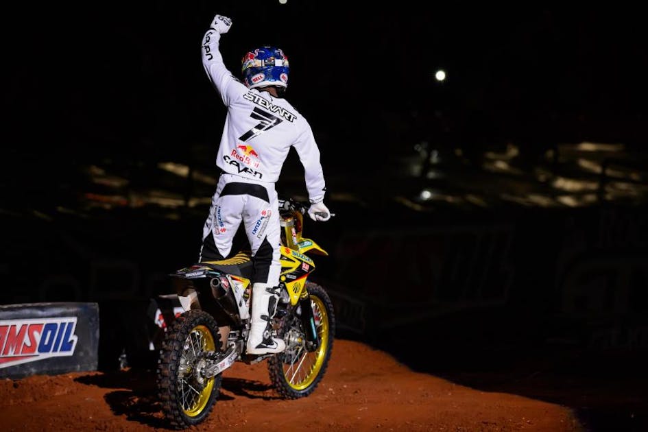 Throughout the day at round eight of Monster Energy Supercross, at the Georgia Dome in Atlanta, the vibe seemed to be pumping James Stewart’s way. Pit pundits thought Stewart could be the man to beat. And he topped qualifying practice. Won his heat race. Then, when the stadium flashed its text to vote display on the big screen before the main event, the crowd went with Stewart as the favorite for the win.