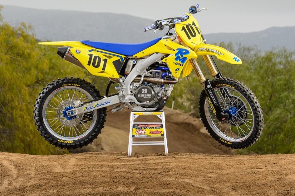This bike was my special project. I love the 2013 RM-Z450 but every bike has its weak points and our goal with these projects is to improve upon the things we think could be better. The very first thing we had to do was improve the looks of this machine. I'm not a fan of the red/black/yellow/white/silver look of this bike in stock trim. I thought it would be cool to create a retro look and when I mentioned that to our friends at One Industries they told me they were working on a 1990 RM replica kit. I loved the clean blue and yellow look back then and I still think it looks amazing. They made the Full Floater stickers special for me but if you are under 30 you probably don't understand what that is.