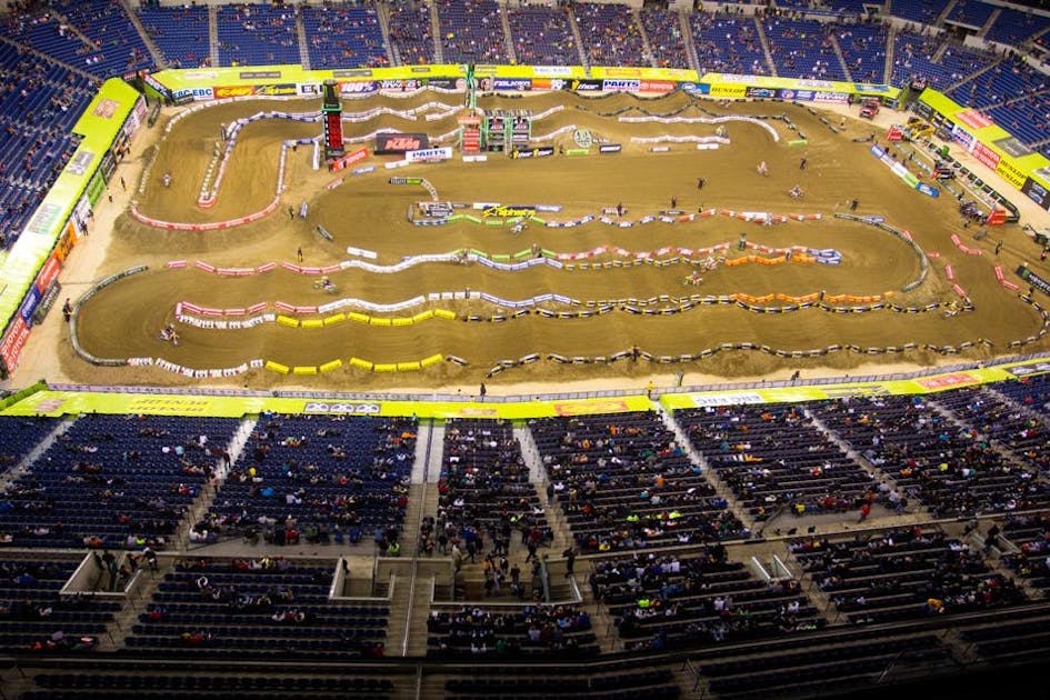 Round 11 of Monster Energy Supercross is underway here in Lucas Oil Stadium. The track here in Indy is tacky early on with a short but big set of whoops presenting some challenges. The second rhythm section should provide a variety of lines, with Jeff Emig telling us earlier that he thinks riders may start to quad into the off-camber turn.