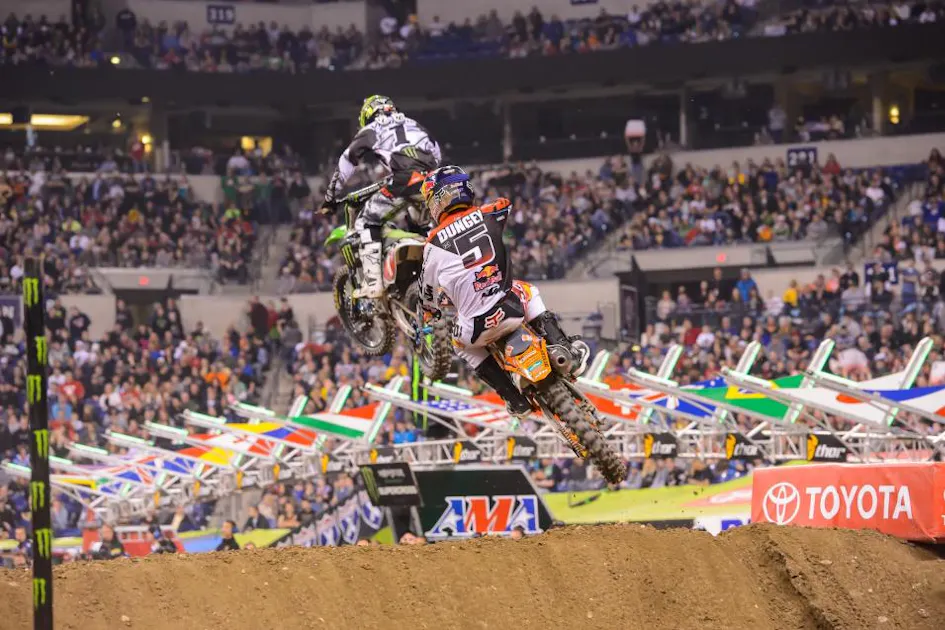 It seemed, at first, like maybe it wouldn’t be Ryan Villopoto’s night. The Monster Energy Kawasaki rider was struggling a bit in practice lap times, although several riders commented that it was hard to get in a clean qualifying lap. But he came back to win his heat and then made things happen in the main event. He and Ryan Dungey were really pushing it, and Dungey even said, “I could tell, watching his riding style, that he was going all out, and then you could see the fatigue kicking in a little bit. And I was feeling it, too.”