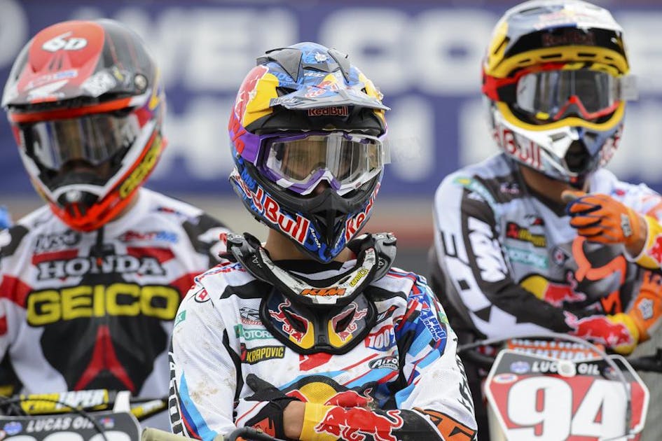 Marvin Musquin finally got himself a moto win at Saturday's GEICO High Point National, and it was well worth the wait. The Red Bull KTM rider has been largely overshadowed by his dynamic young teammate Ken Roczen the past couple of years, even though he was the first of the two to win an outdoor overall (Unadilla last year). Even now it's Roczen who's shown the most speed in the 250 Class—but then he's had problems closing the deal at both Thunder Valley and Muddy Creek. On Saturday the German was brilliant in the first moto, then simply got beat in the exciting second moto by the Frenchman. A distant third place went to Zach Osborne.
