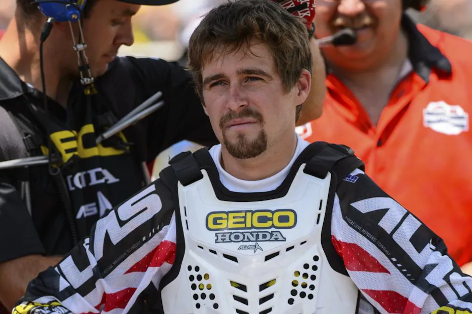Hahn was smart to run away once he got back to the starting line area. Between the gate and the pits at Southwick sits a steep hill, and there’s no way a rider is going to push a bike up it. “First moto, I think Davey [Coombs] or someone at MX Sports arranged a ride up the hill,” Hahn explains. “Second moto, K-Dub’s mechanic got on the bike and held onto the roof of a golf cart using his arms as tow ropes. It was pretty good.”