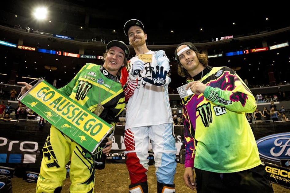One-handed and nac 360 flips were just a couple of the insane tricks that Australian Blake “Bilko” Williams brought to the table in Speed & Style. Garth Milan ![The finals kick off between Bilko and Adams. Although it was important to get the holeshot, Adams proved that it wasn’t necessary to pull off a win.]()