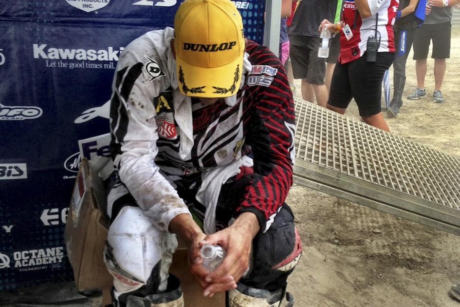 A full-on motocross mercenary chasing prize money and sponsors however and wherever he can, Peick had driven from California to Utah in his van with a borrowed trailer, and his mechanic was not his dad, Louie, but his friend Dave Cruz. So when the race ended and the NBC Sports crew waved him in to wait for an interview, Weston handed his bike to his mechanic, walked over and grabbed a bottle of water from the podium cooler, and then just sat down and waited. His friends/sponsors Max Steffans from Fly Racing and Brian Fleck from Dunlop took turns patting him on the back and switching out his hats, Weston smiling just a little, revealing a hint of personal pride in what would be a huge accomplishment for anyone who has ever ridden a motocross bike.