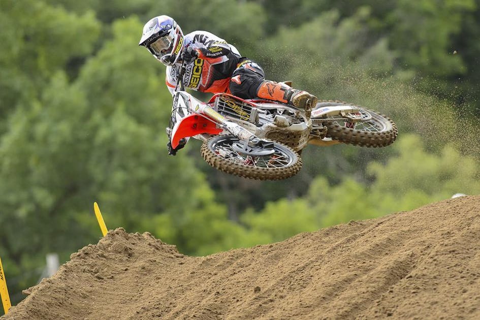 Pretty unique that Eli runs ear plugs while he's riding. Here he removes them so he can hear the RedBud crowd even better. Simon Cudby ![At times, ET makes a 200 plus-pound CRF250R seem like a little BMX bike.]()