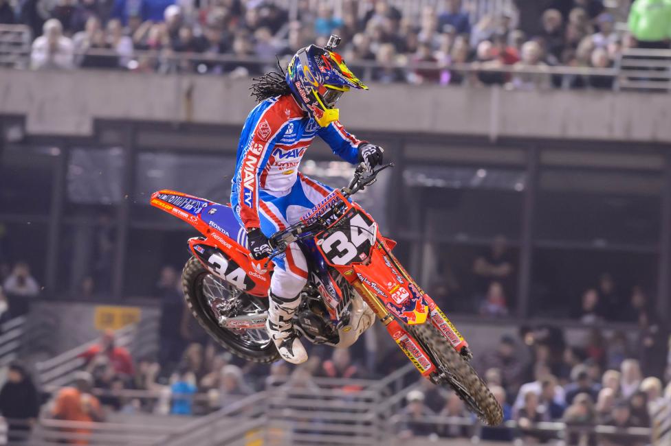 The race was alright. I got a pretty good start and banged around a little in the first few turns. I tried to make my way to the front and made a dumb move trying to rush. I collided with Malcolm [Stewart] and we both went down. It sucked for sure, but we’ll move on from here. Nothing we can do but look to the future. I had a really bad crash in practice and popped my wrist out of place and sprained it. Doc G helped me out a lot and got it back in. I was just trying to ride through that and do the best I could.