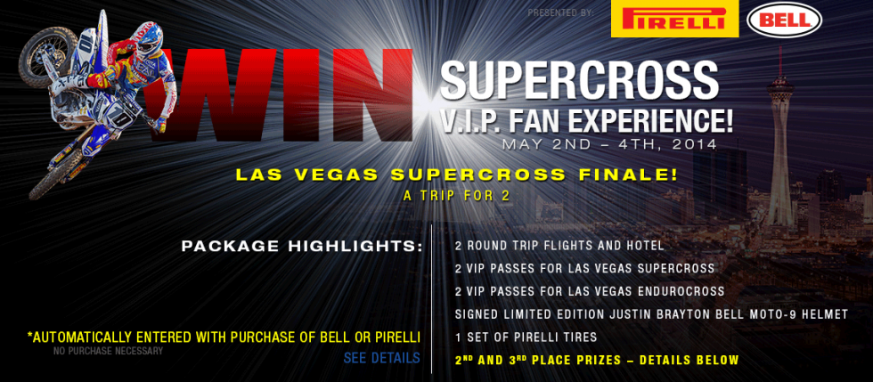 Be automatically entered with purchase of Bell or Pirelli product placed during the contest period (Feb. 7 – Mar. 9, 2014). No purchase necessary. Qualifying orders must be approved and confirmed by contest end date. See contest terms and conditions for complete details. Shop Motorcycle Superstore’s complete selection of Bell Helmets and Pirelli Tires