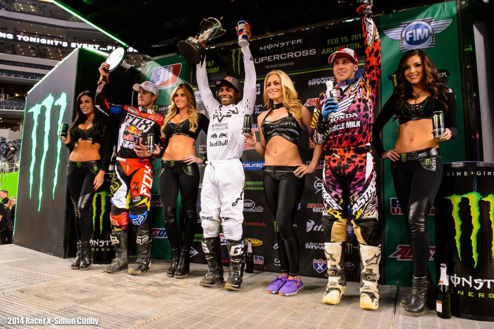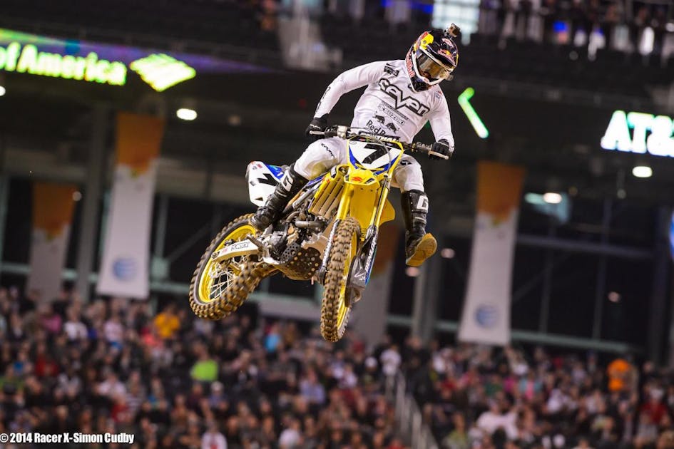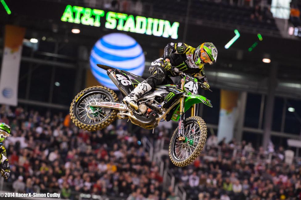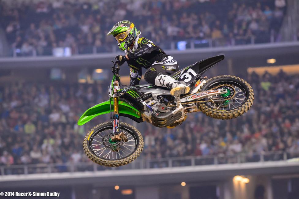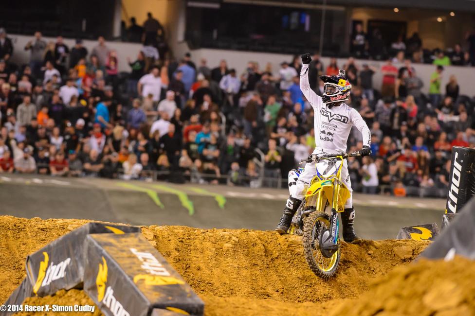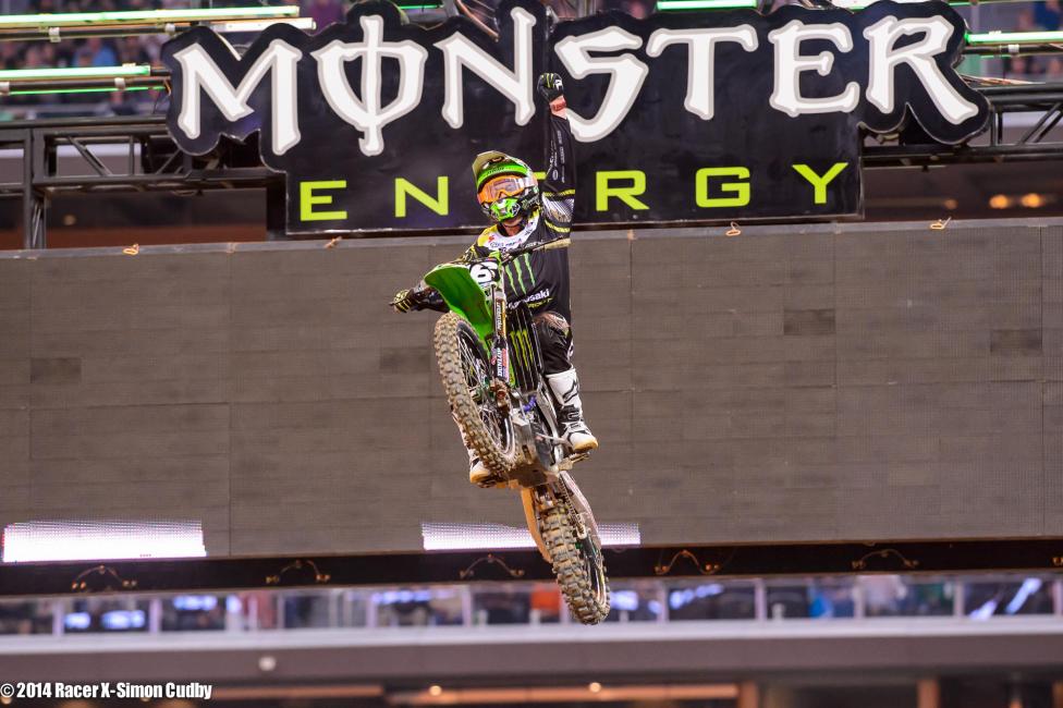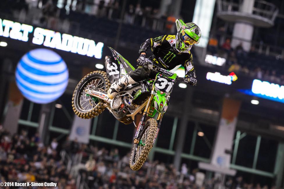 This weekend marked the attempted return of Chad Reed after his devastating crash in San Diego last weekend as well as the emergence of a handful of supercross rookies for the opening round of the 250SX East series. Reed didn’t fare too well with his injury early on in practice and had to call it a day, but his seasoned rival stepped up once again to take another win this season. Yoshimura Suzuki’s James Stewart captured the first set of back-to-back wins seen in the 2014 450SX series here in Arlington. Though Stewart ranks in at third on the all-time supercross win list, the other winner from tonight’s races is only getting started. Monster Energy/Pro Circuit Kawasaki’s Adam Cianciarulo captured the 250SX East opener win in his debut supercross appearance—but first, let’s take a look at the 450SX main event.