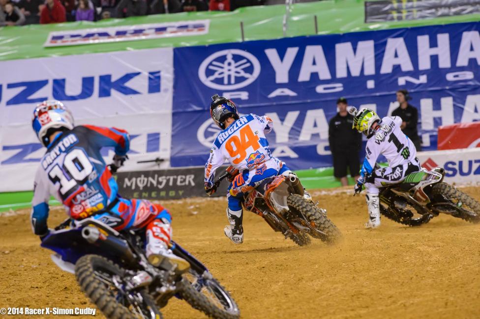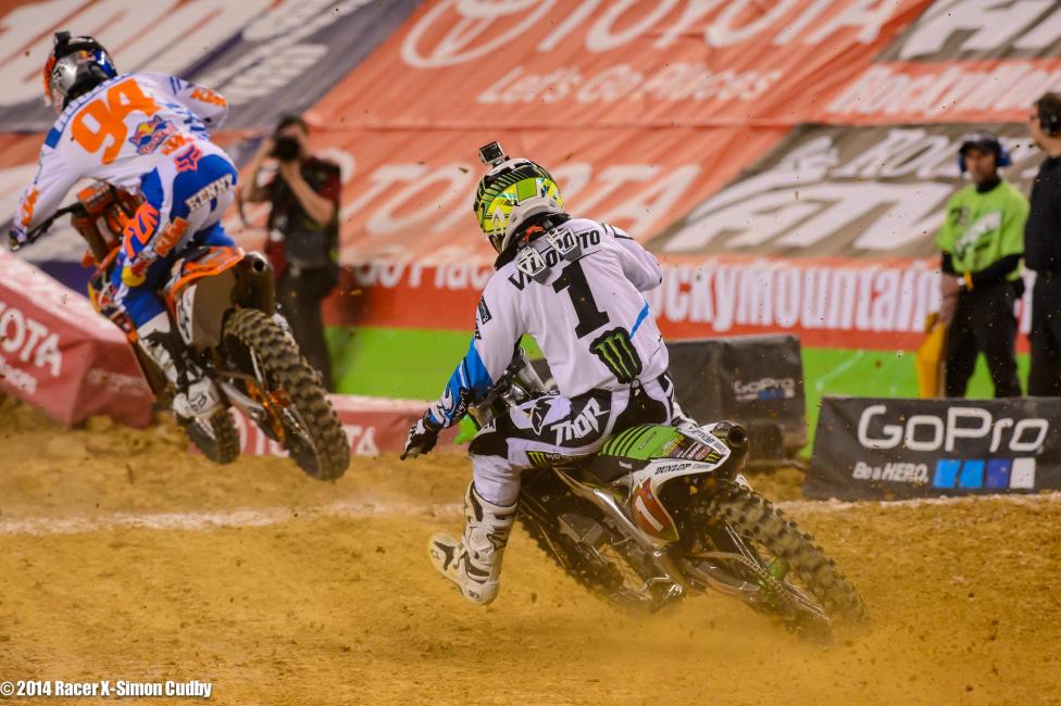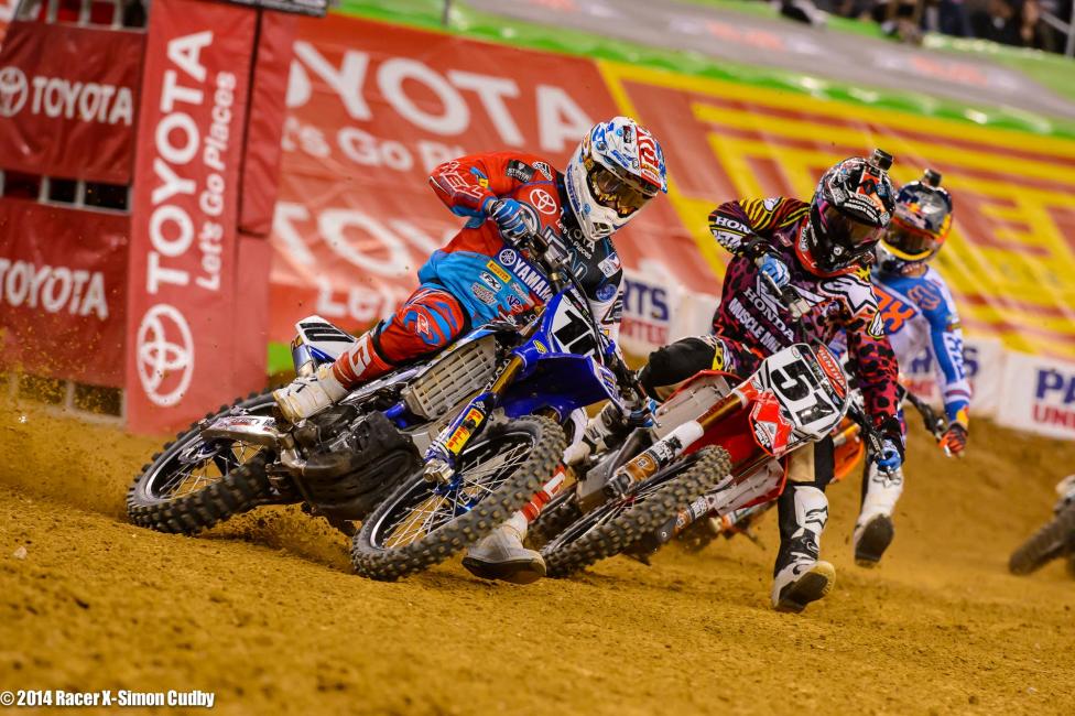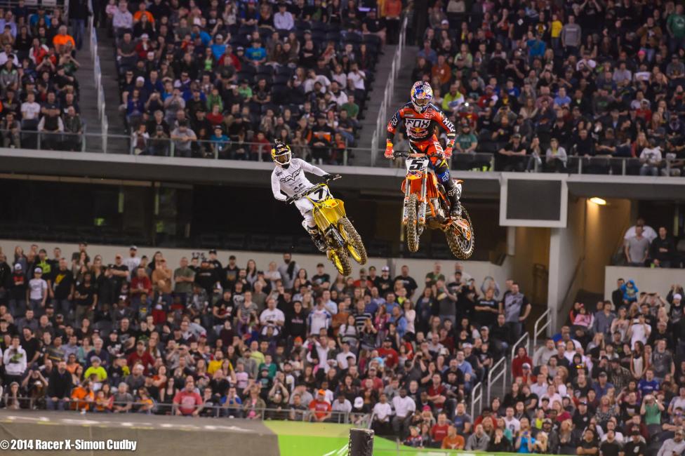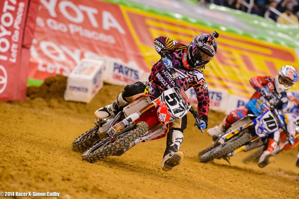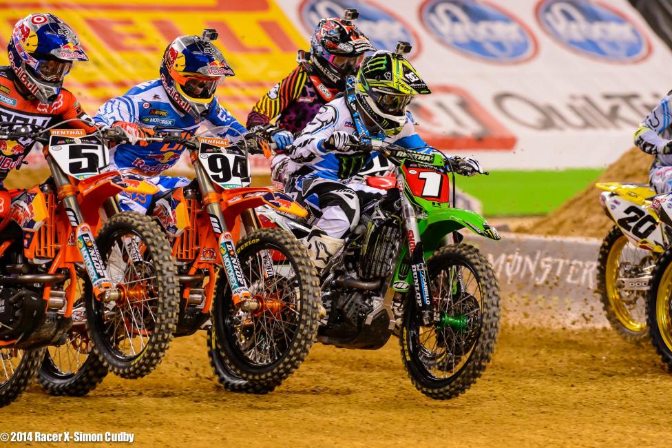 This weekend marked the attempted return of Chad Reed after his devastating crash in San Diego last weekend as well as the emergence of a handful of supercross rookies for the opening round of the 250SX East series. Reed didn’t fare too well with his injury early on in practice and had to call it a day, but his seasoned rival stepped up once again to take another win this season. Yoshimura Suzuki’s James Stewart captured the first set of back-to-back wins seen in the 2014 450SX series here in Arlington. Though Stewart ranks in at third on the all-time supercross win list, the other winner from tonight’s races is only getting started. Monster Energy/Pro Circuit Kawasaki’s Adam Cianciarulo captured the 250SX East opener win in his debut supercross appearance—but first, let’s take a look at the 450SX main event.