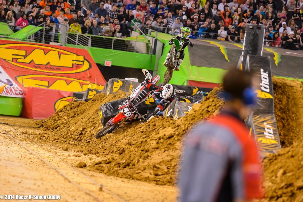 Barcia was unable to triple onto the tabletop before one of the two standard supercross triples, which allowed Brayton to move into third.