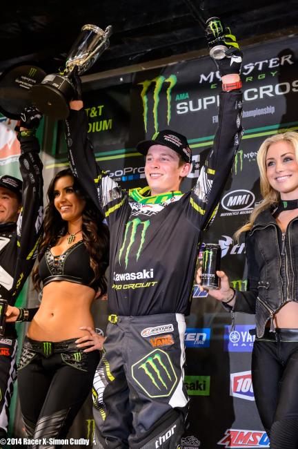 Cianciarulo and Baggett diced it out for a lap before Cianciarulo took the lead once and for all. After a less-than-stellar Pro Motocross debut, Cianciarulo cleaned his professional racing slate by seizing the win in his debut supercross race. Baggett followed up his teammate for a second-place finish, as did Davalos for an all-Monster Energy/Pro Circuit Kawasaki podium.