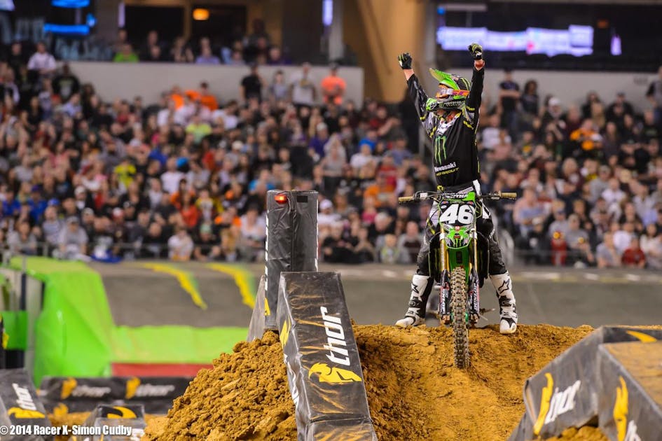 Believe the hype? Monster Energy Pro Circuit Kawasaki’s Adam Cianciarulo won the race by riding very unlike a rookie—he was smart and solid and loose the whole way and never let the nerves get to him. When Davalos crashed he inherited the lead, and showed some great race craft in fending off a challenge from his teammate teammate Blake Baggett. Yes, this is AC’s first supercross race ever. “There was no way I was gonna’ beat him, [Davalos] he was pulling away for sure,” said Cianciarulo. “I was just riding my laps, and he made a mistake and I was like “Oh my God I’m in the lead.” I don’t think I would have won if I hadn’t been out front at Loretta’s and stuff like that, all those amateur races. It might sound weird but being out front and being familiar with it. I just tried to get it out of my mind that I was going to win a supercross race.”