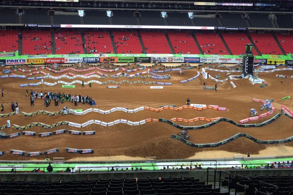 Monster Energy Supercross has finally come all the way east, and with this trip comes the kind of dirt and traction the riders have been looking for. It's not old school mega soft rutted track red clay here in the Georgia Dome, but it's still much softer than last week's race in Dallas, which became the standard "goat trail" with one main, baked in race line. Here, by the end of the first group in practice, ruts had formed in a few turns. Other spots, though, are dry and look pretty slick, but as a whole it's tackier than most of the tracks so far this year.