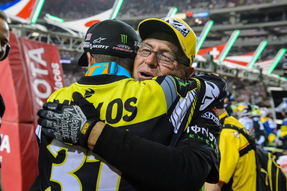 Definitely. Adam is such a great kid. He’s going to be very, very good. There’s a lot to learn. Obviously I do have more experience than him. And always, being in second place is good, he was behind me and riding good. I felt like he had a really, really good line through the whoops. He was jumping more consistent. But let me tell you, tonight the track was really tough, especially for us. It was hard to get momentum through the whoops, and the ruts before the whoops coming into them were really, really tough. So, trying to find traction, I just told myself 15 perfect laps, make the best out of it in the whoops and keep it consistent.