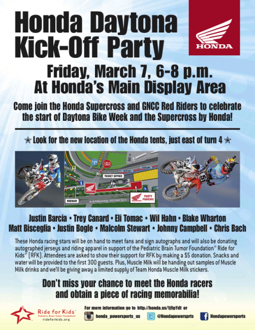 Be sure to come join the Honda Supercross and GNCC Red Riders to celebrate the start of Daytona Bike Week and the Supercross by Honda on Friday, March 7, 6-8 p.m., at Honda’s Main Display Area (look for the new location of the Honda tents, just east of turn 4).
