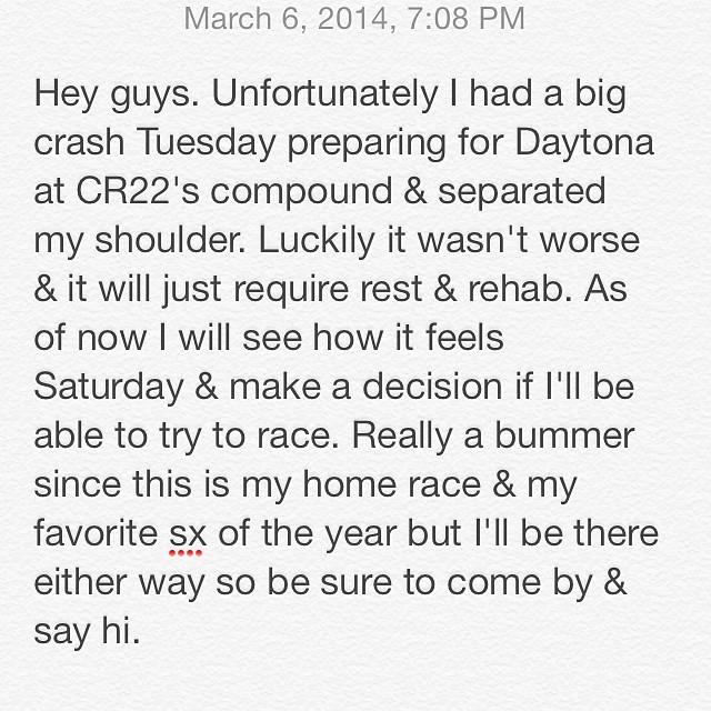 CycleTrader.com Rock River Yamaha's Kyle Chisholm is questionable for round 10 of Monster Energy Supercross at Daytona after separating his shoulder earlier this week. Chisholm posted the following on Instagram: