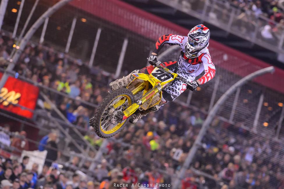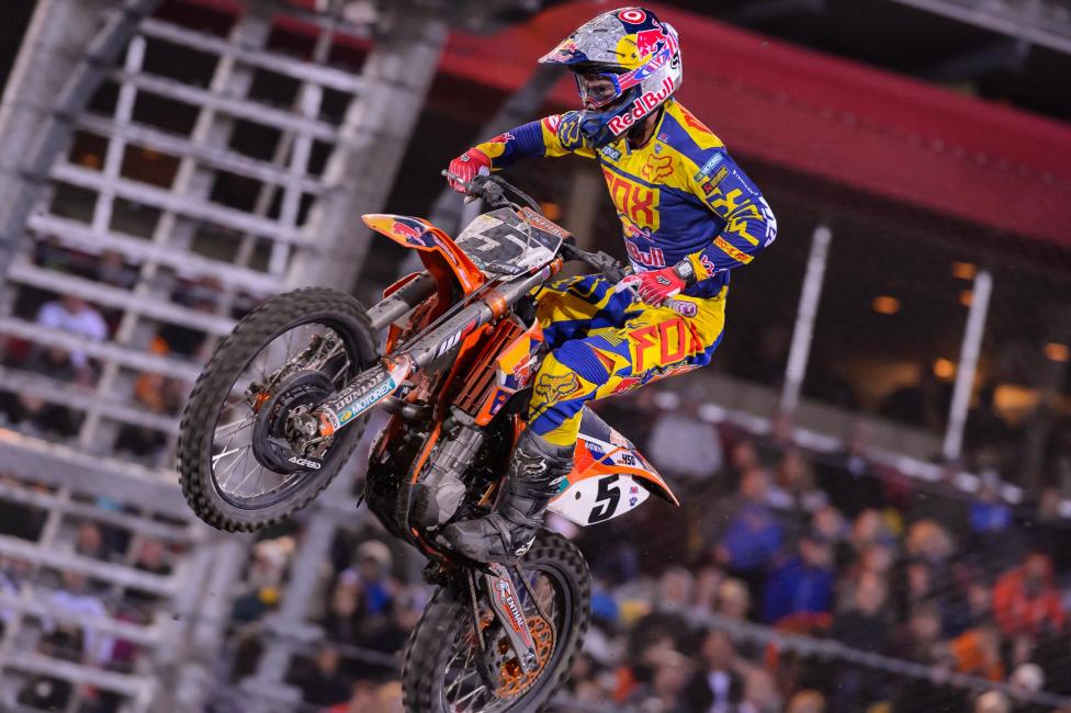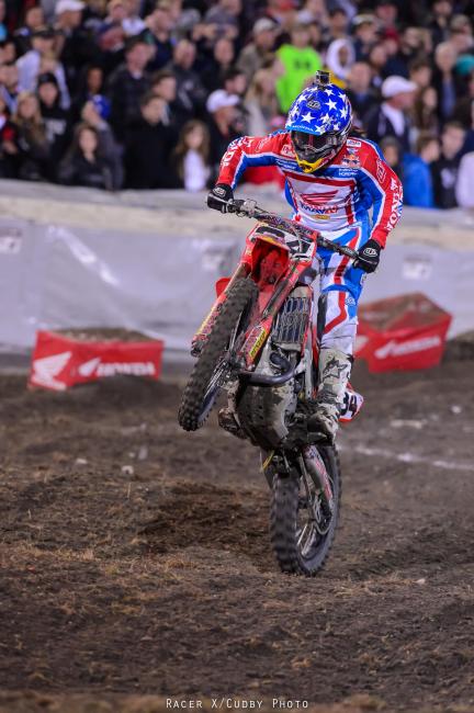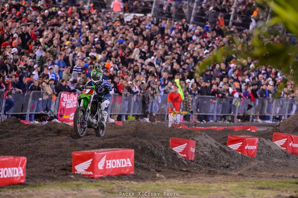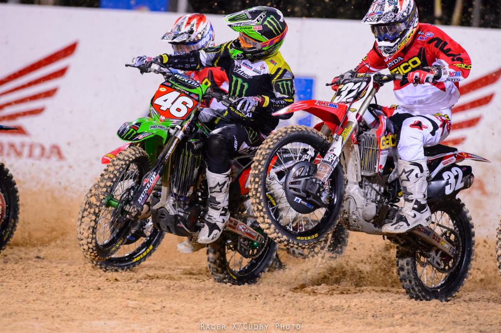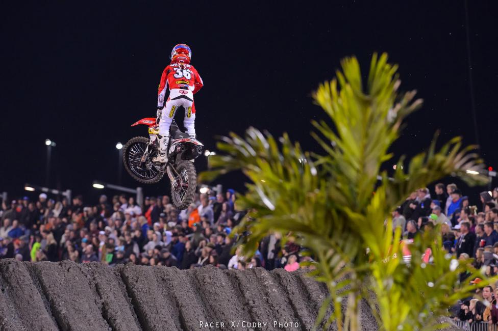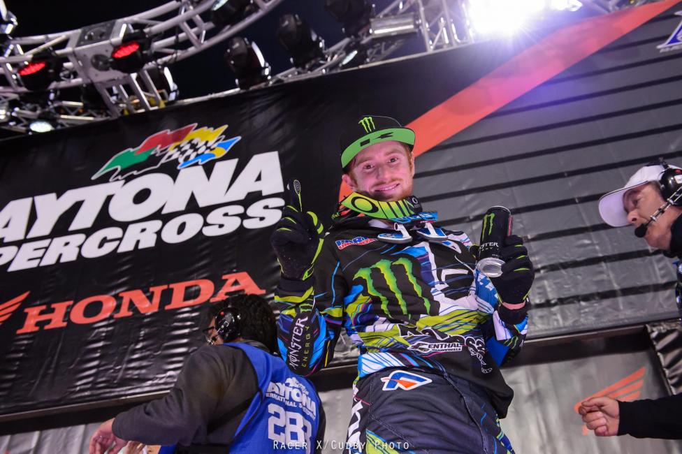 In 250SX, we can officially put to rest any notion that Monster Energy/Pro Circuit Kawasaki has “lost a step”, as the green crew sweep the podium for the second time in four races. Entering Daytona 18 points back of rookie teammate Adam Cianciarulo, Blake Baggett took advantage of the rough terrain to capture his first win of the season, and his first since Las Vegas in 2011. Cianciarulo still maintains control of the points lead following a second, with Martin Davalos finishing off the Pro Circuit podium sweep.