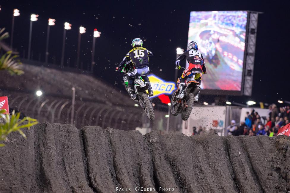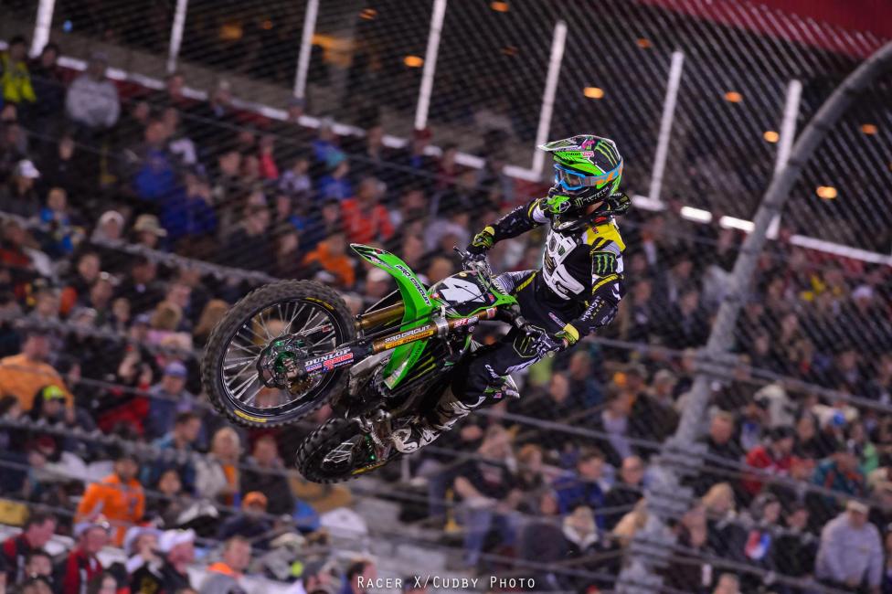 Monster Energy Kawasaki’s Ryan Villopoto moved one step closer to history following a dominating performance at round 10 of Monster Energy Supercross at Daytona International Speedway. Heading into the event, the three-time and defending champion held a 23-point lead over Ryan Dungey in his quest to join Jeremy McGrath as the only riders to achieve four consecutive premier class titles. Villopoto tamed the notoriously rough Daytona circuit en route to an impressive win—his first since round 4 in Oakland—increasing his lead to 28 over Dungey.