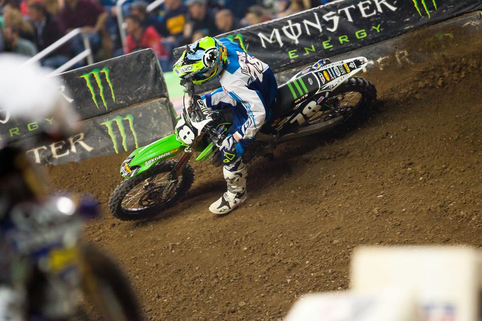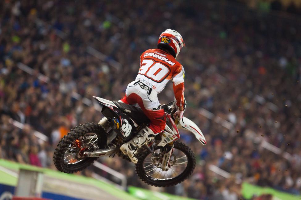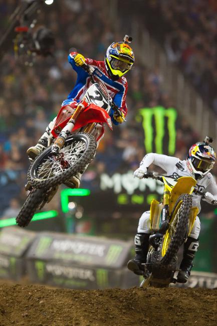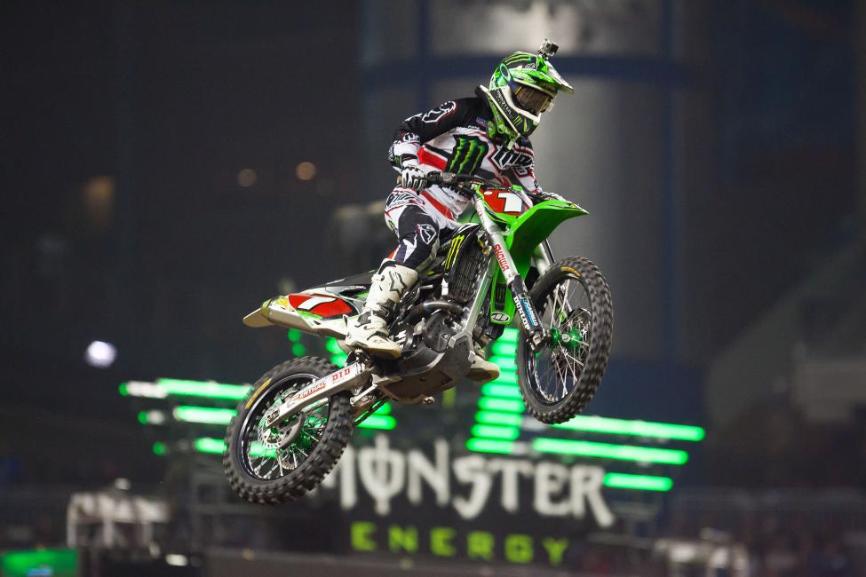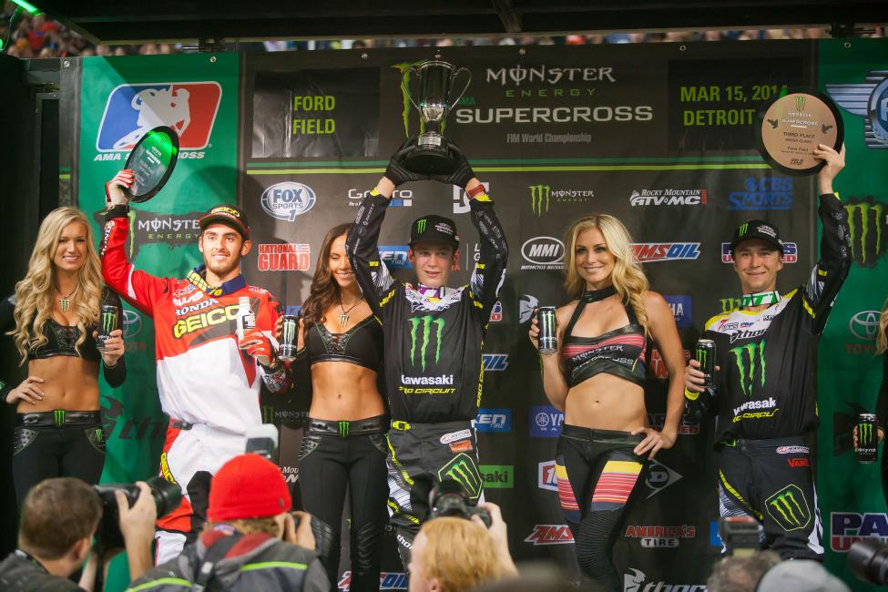 It’s been a trying three rounds for Yoshimura Suzuki’s James Stewart, as he has all but been eliminated from title contention after finishes of 11-7-18, but on Saturday night inside Ford Field in downtown Detroit, Michigan, the Suzuki ride was in pure form. After getting around Muscle Milk Honda’s Cole Seely early, Stewart was flawless in his defense of Monster Energy Kawasaki’s Ryan Villopoto early advances, cruising to his third win on the season. The win was Stewart’s 48th of his career, tying Ricky Carmichael for second on the all-time wins list.