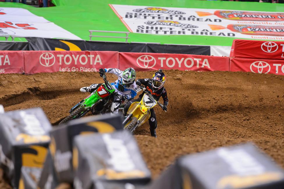 It definitely was tricky, you had to get in the whoops and make sure you hit every one or otherwise you’d skip over the top. I was going inside all day until we figured out the bike—it was smoother over there. But then RV started going to the inside so I had to switch it up and go somewhere else. The only time I think I went outside all day was in the main event and that was because of a lapper. I think it was quicker, but I didn’t trust it, so I went back to the inside.