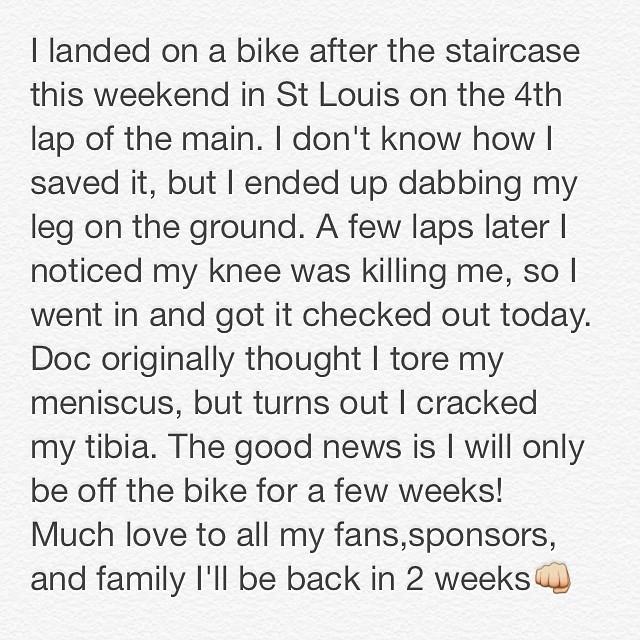 GEICO Honda rookie Matt Bisceglia suffered a cracked tibia on lap four of the main in St. Louis after landing on a bike. He lost a few positions but somehow finished 7th in the main! Bisceglia posted the following on Instagram yesterday: