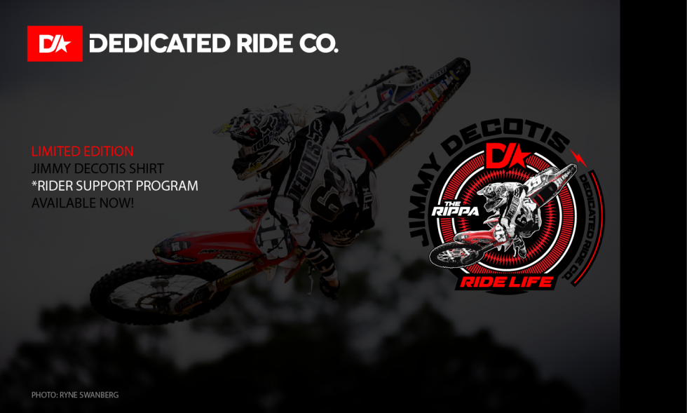 Dedicated Ride Co. has released the limited-edition Jimmy DeCotis T-shirt, which is now available for purchase as part of their rider-support program. Proceeds go directly to DeCotis to support his racing efforts. Go to www.dedicatedrideco.com and order yours today!