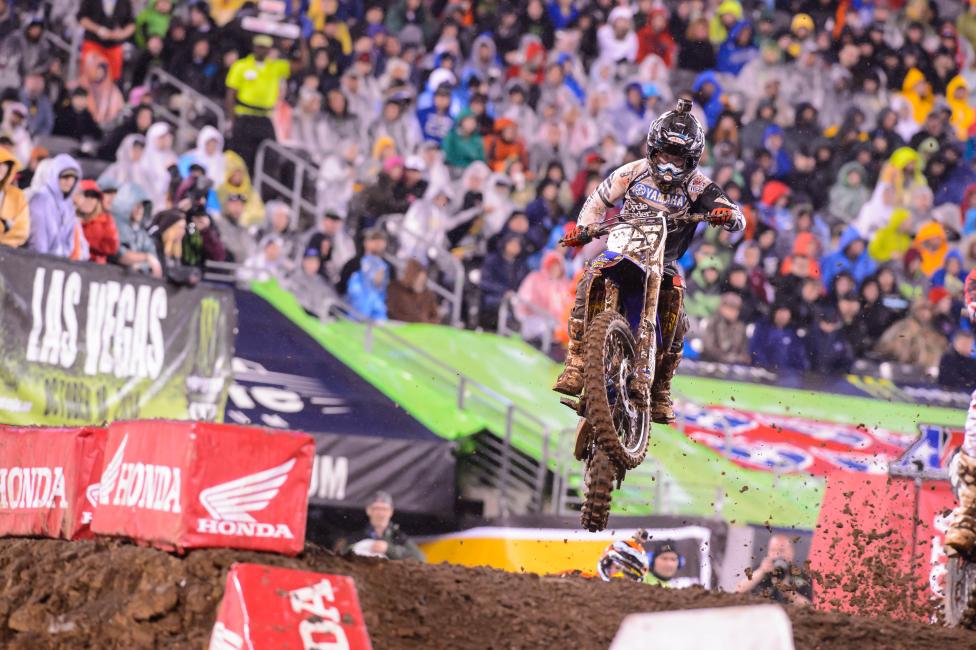 To be honest with you it hurts less than my ribs do. It was kind of like I popped the shoulder, I got it back in. Obviously it’s stiff but I’m kind of used to that by now. My rib injury from Houston, any time the track gets choppy, it just beats me up. It’s getting a lot better. I wasn’t even able to race at Seattle and now I’m able to kind of go out there and do a little bit. It was a good weekend. I wish I would have stayed up in the main and not crashed. I felt like it could have been a good night for me, but once I crashed it kind of took the wind out of my sails. By the time I got back on the track I was so far back, I was just kind of bummed out on that. I feel like I came a long ways tonight as far as laying down in the second practice with my shoulder out of place and kind of steadily improving all night. But it is what it is. We got one more race left. It’s still good to be out there in the main and racing and putting the bike in the main. All in all it’s not a bad night.
