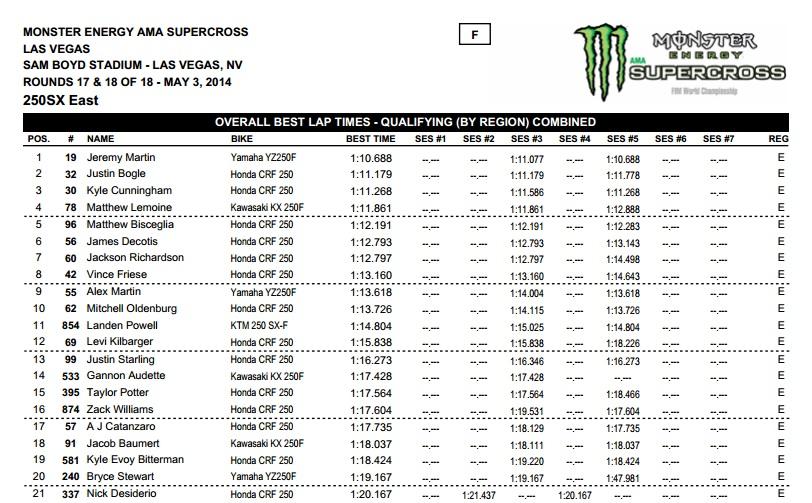 In Eastern Regional 250SX Qualifying Matt Bisceglia was riding great and spent time at the top of the board in both sessions, but Jeremy Martin would lay claim to fastest qualifier in both outings. Kyle Cunningham, who always goes fast here, was also fast, qualifying third fastest overall. Bogle was second fastest overall, but had a couple crashes in the second session that seemed to shake him up a little.