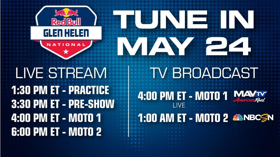 Don't miss the television or online coverage of the season-opening Red Bull Glen Helen National. Get the rundown below on how to watch practice, the exclusive online pre-show and all four motos on Saturday, May 24.
