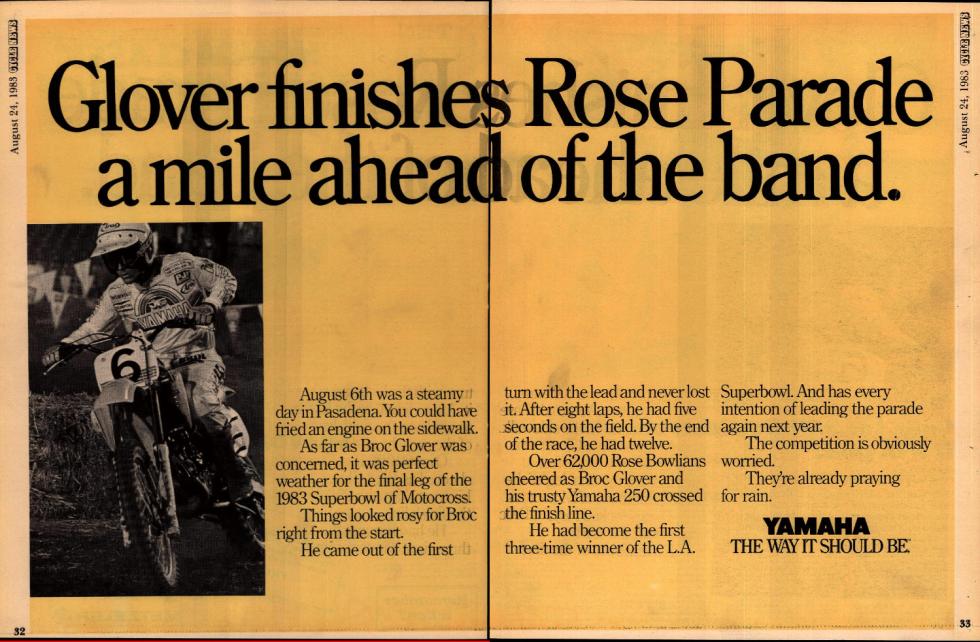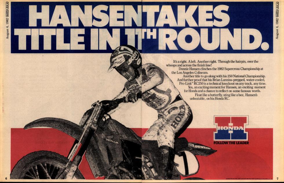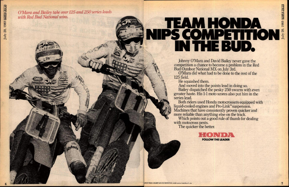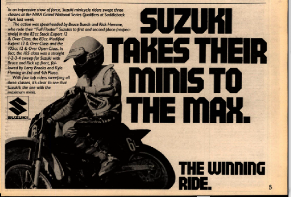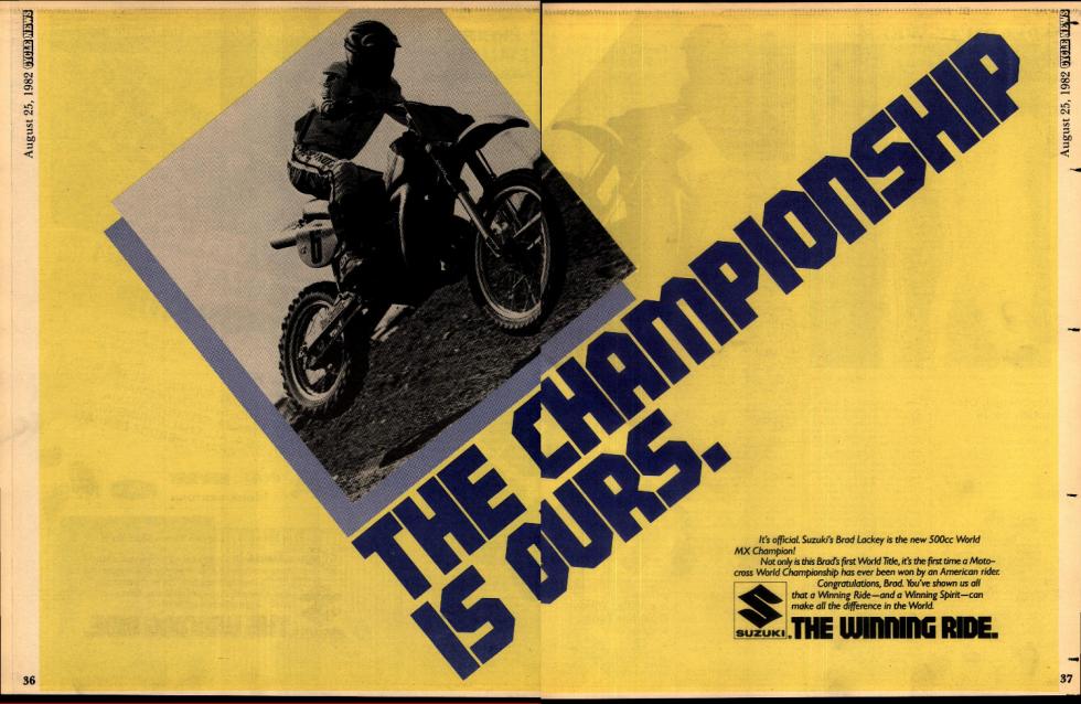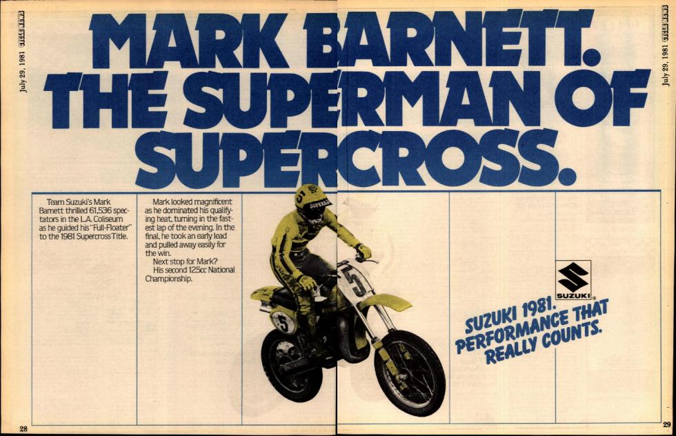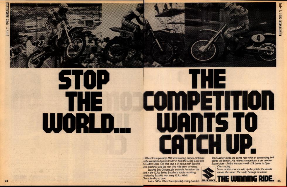 Eric Johnson used to be one of those "Mad Men" who wrote advertising copy, including some Suzuki win ads after graduating college and moving out to the west coast. As a result, he's always kept his eyes open for cool win ads, especially from the 1980s, his favorite era as a young motocross fan. With the sweet Cycle News archives now online, EJ recently went through a few years and pulled out these amazing advertisements featuring superstars like David Bailey, Broc Glover, Johnny O'Mara, Ricky Johnson, Danny "Magoo" Chandler and more. Check them out and see which ones you remember!