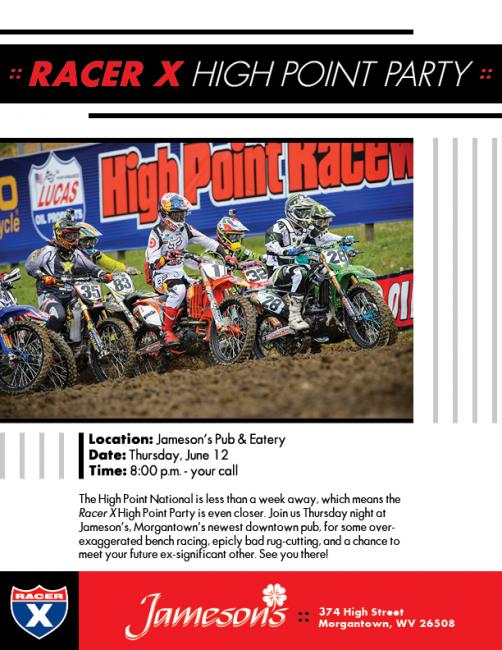 Racer X High Point Party Tonight June 12, 2014, 1:00pm Home Breaking News Racer X High Point Party Tonight - Motocross Mt. Morris, PA High PointAMA Pro Motocross Championship