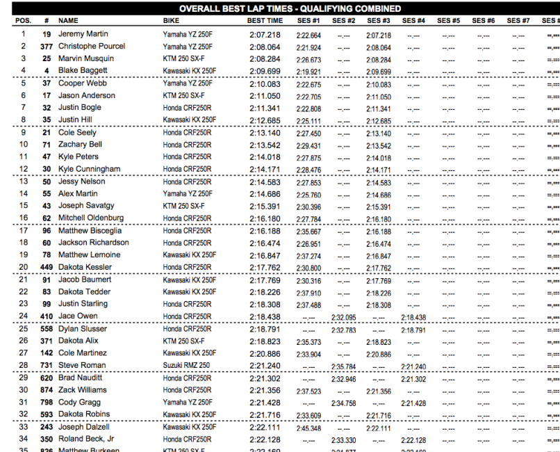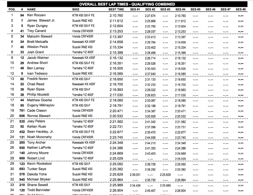In the 450 Class, rookie Ken Roczen continues to impress in his first season. The German set a 2:10.760 to capture the top spot over James Stewart (2:11.612), Ryan Dungey (2:12.604), Trey Canard (2:13.252) and Malcolm Stewart (2:13.397).