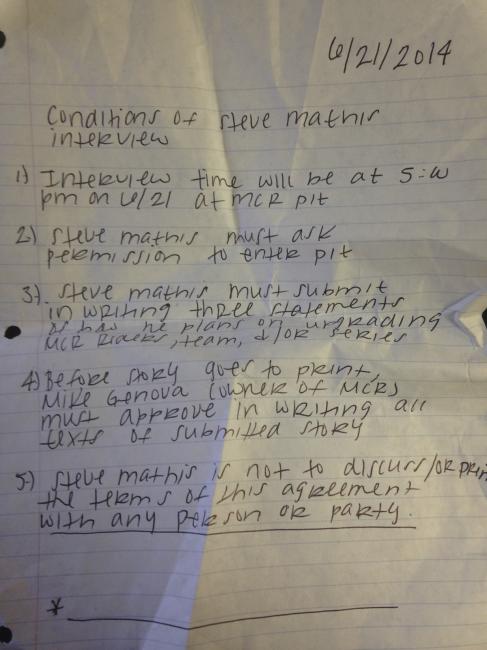 I told Tony that I was taking the document to “review it and possibly Tweet it” when Tony said that the document could not leave the team pit area. But he didn’t present that term before he gave it to me and besides, what kind of contract between two parties is signed without each party getting a copy?