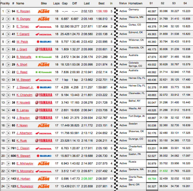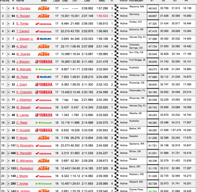 Trey Canard was off the pace of the leaders again, but never received a challenge from fifth. Weston Peick made a late run to catch and pass Josh Grant to capture fifth. Brett Metcalfe, Andrew Short, Chad Reed and Malcolm Stewart would finish out the top ten.