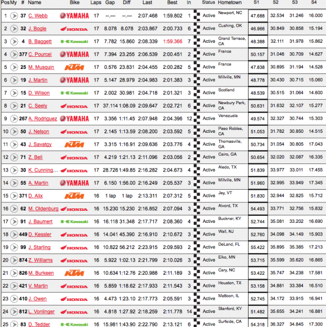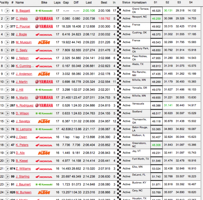 Justin Bogle was there to capitalize on Baggett’s mistake, and took second by more than six seconds over Baggett. Pourcel, despite his late tangle with Baggett finished fourth, with Marvin Musquin, Jeremy Martin, Dean Wilson, Cole Seely, Anthony Rodriguez and Jessy Nelson finishing out the top ten.