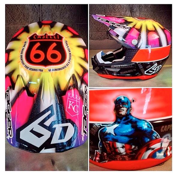 The inspiration behind the helmet really comes from a variety of components. Each of these components symbolize the racer and person he was in life. First and foremost, the bottom portion of the helmet includes all the race sanctions to which Kurt participated successfully. On the back of the helmet you'll find an airbrushed animation of Captain America. This nickname was given to Kurt as he was the Captain of the ISDE 6 Day Team and the top American to compete in the event, annually. At the top of the helmet, suurounded by bright beams of light, sits the Caselli 66 logo. On both sides, you'll find quotes that Kurt seemed to live by. This helmet is truly one of a kind.